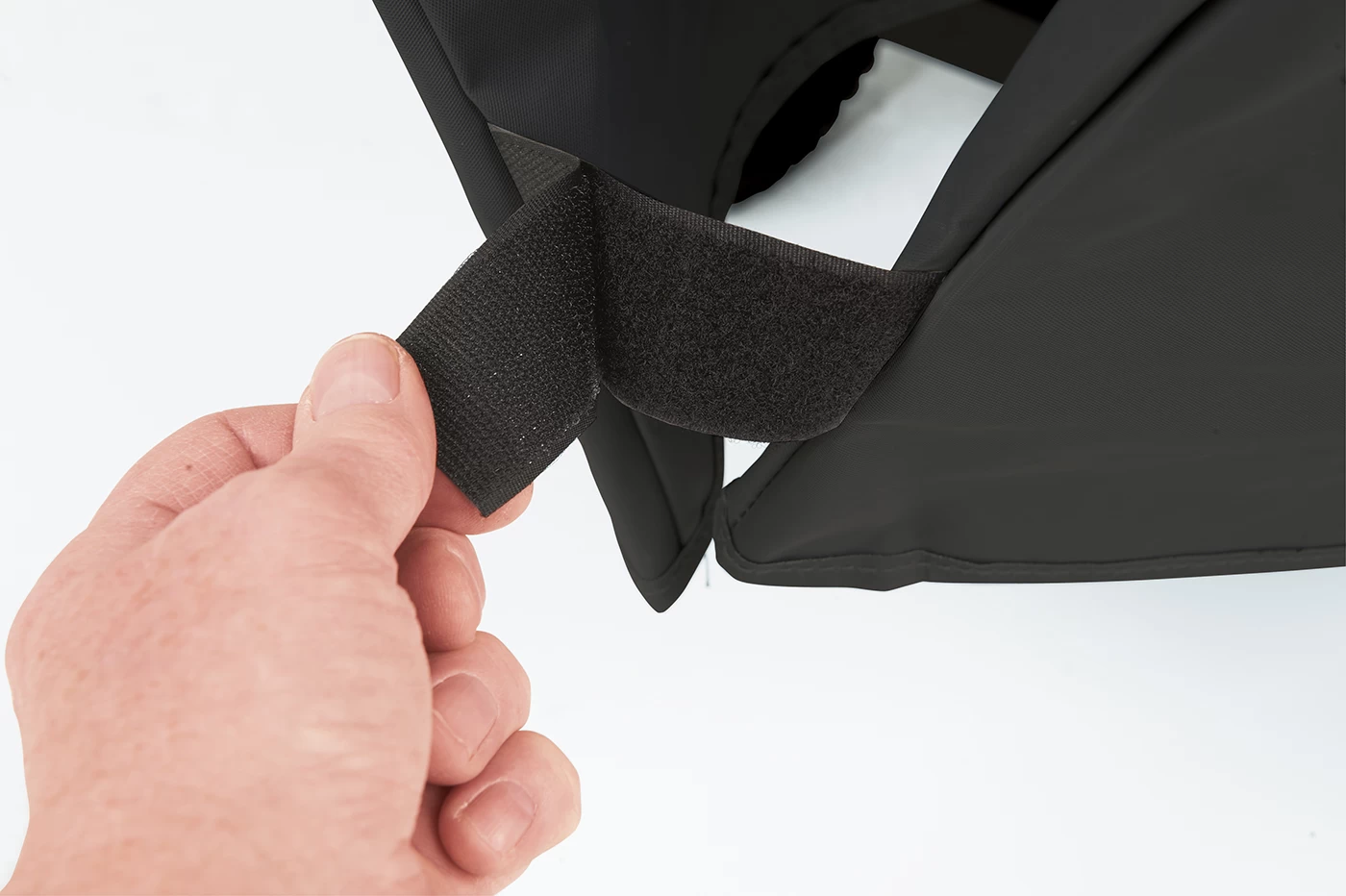 Mit seitlichen Klettverschlüssen lässt sich die Haube leicht fixieren und zwei stabile Grifflaschen helfen beim Abziehen.