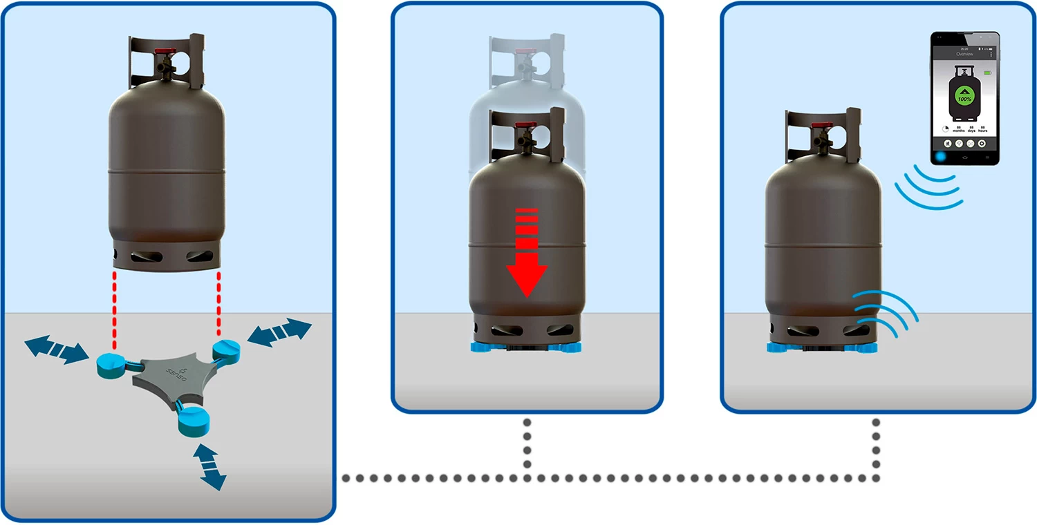 Das Senso4s Basic System besteht aus einer größenverstellbaren Gasflaschenwaage (für verschiedene Gasflaschendurchmesser) und einer App fürs Smartphone (Android und iOS), welche via Bluetooth mit dem Füllstandsanzeiger gekoppelt wird.
