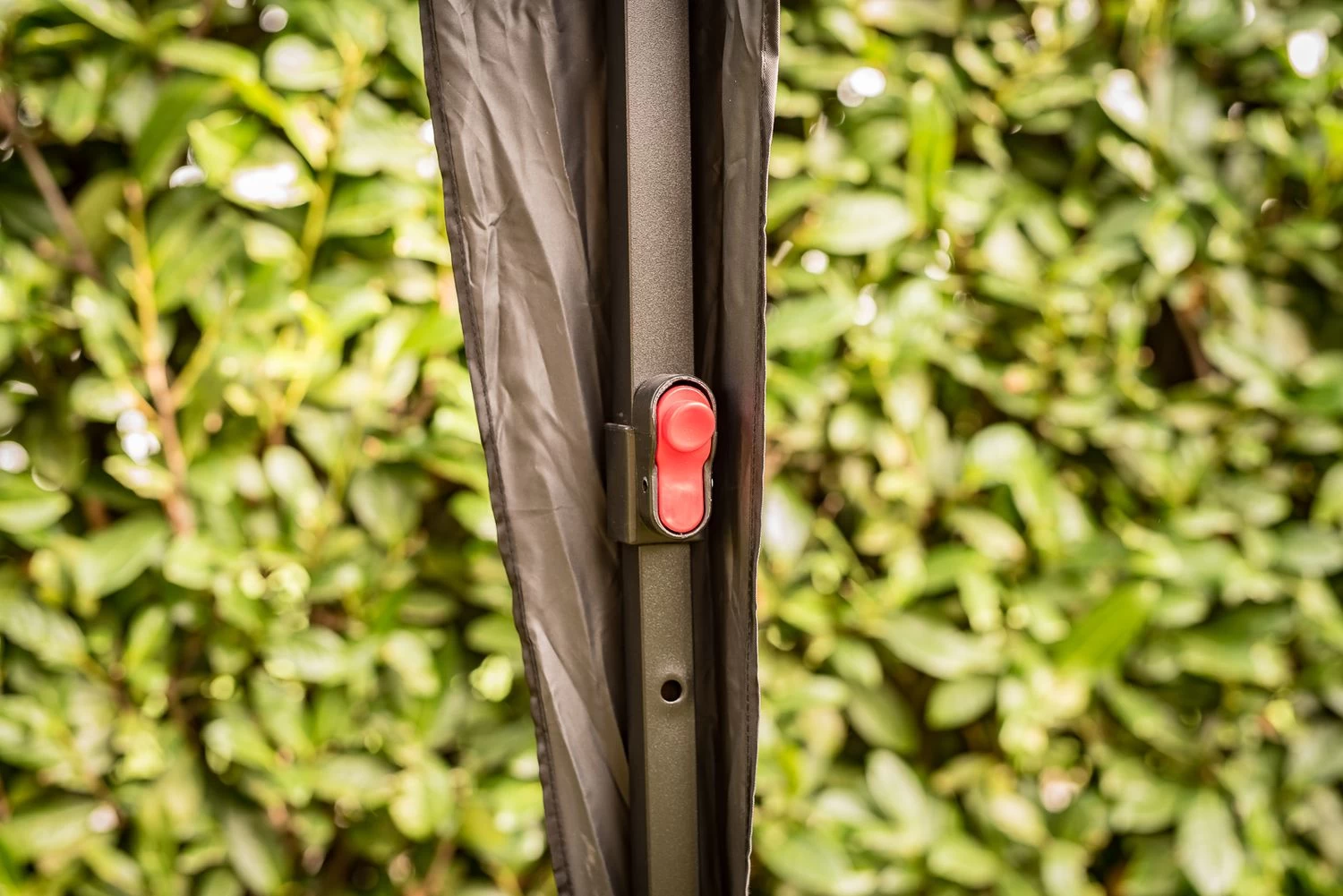 Einfach den Pavillon aus der praktischen Tragetasche nehmen, positionieren und auseinanderziehen, Abdeckung befestigen, die Beine ausziehen und arretieren – schon ist der Pavillion aufgebaut.