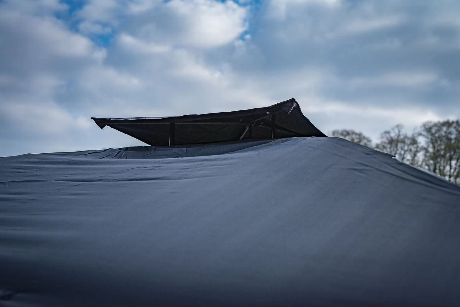 Das wasserdichte Dach mit einer Spezialbeschichtung ist das Highlight dieses tollen Pavillons. In der Mitte der Konstruktion ist eine Öffnung eingearbeitet, durch die der Rauch und Qualm des Grills prima abziehen kann. Darüber sitzt ein weiteres kleines Dach als Abdeckung der Öffnung. Dieses durchdachte System vehindert zuverlässig, dass sich Rauch, Stauwärme und Kondensat unter dem Dach sammeln können und sorgen für ein angenehmens Klima am Grill.