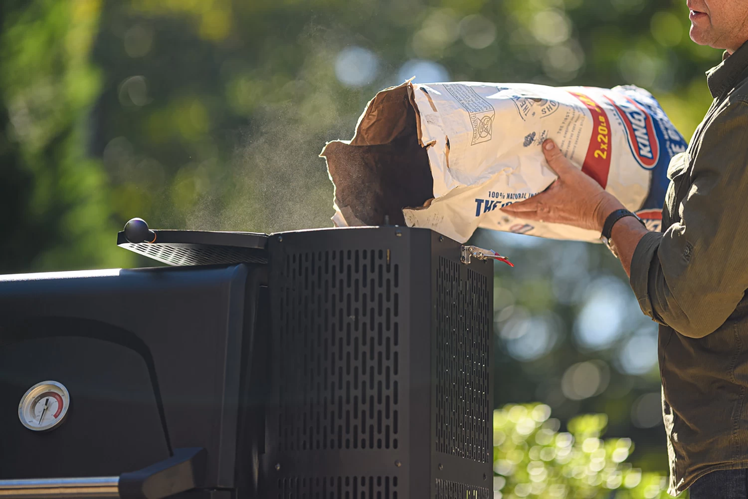 Die Holzkohle wird zum Betrieb in den Gravity Fed Holzkohle-Tank gefüllt, ähnlich wie bei einem Pelletgrill. Nach dem Anzünden rutscht die Holzkohle dann stetig nach und hält die Glut bei konstanter Hitze. Mit Hilfe eines Lüfters wird die heiße Glut geschürt und so die Flammen bzw. die Hitze unter die Grillfläche geblasen.