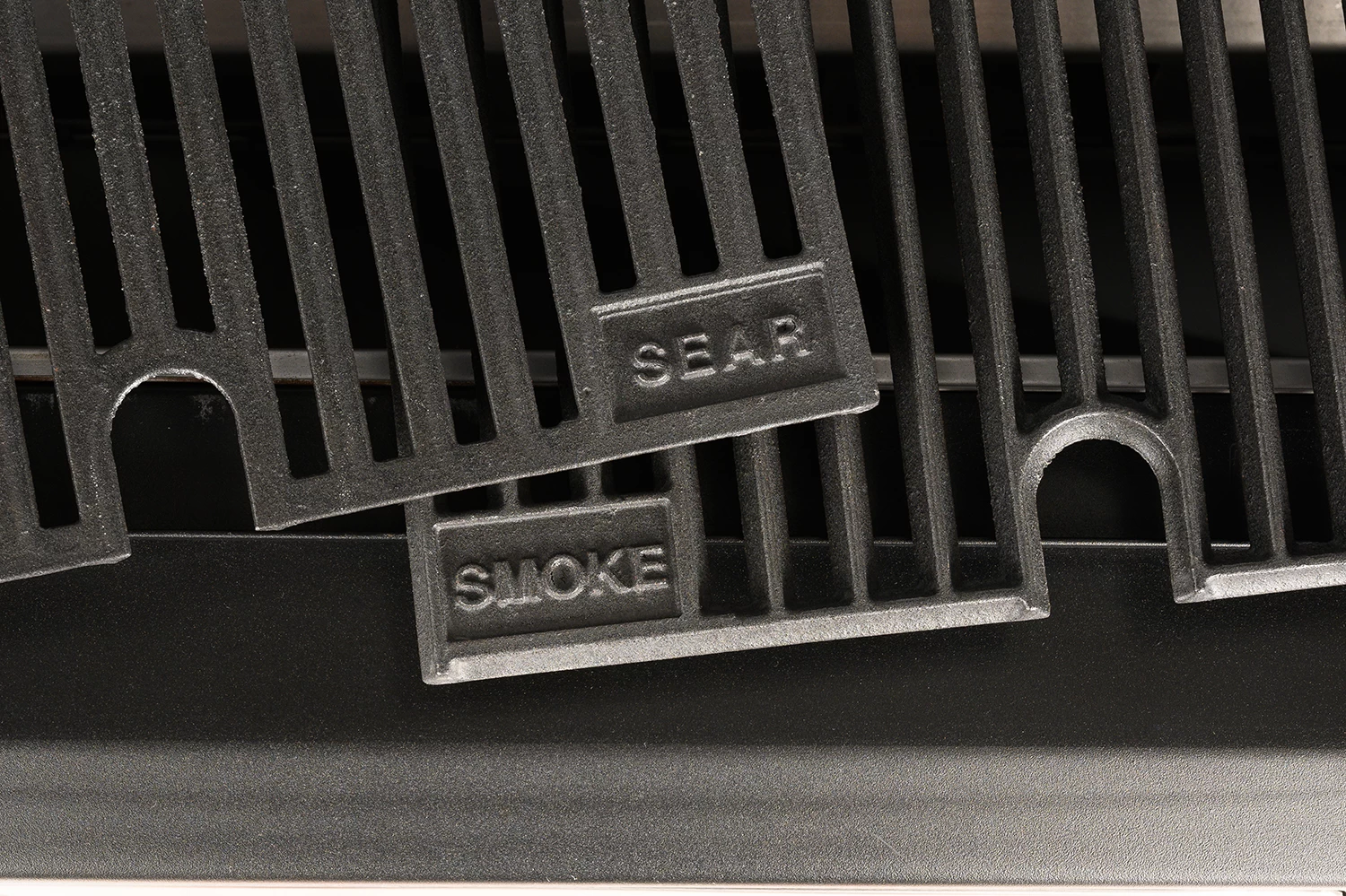 Die Gusseisen Grillroste auf der unteren Grillfläche besitzen 2 verschiedene Seiten. Eine Seiten zum Räuchern, die andere für satte Brandings beim Grillen.