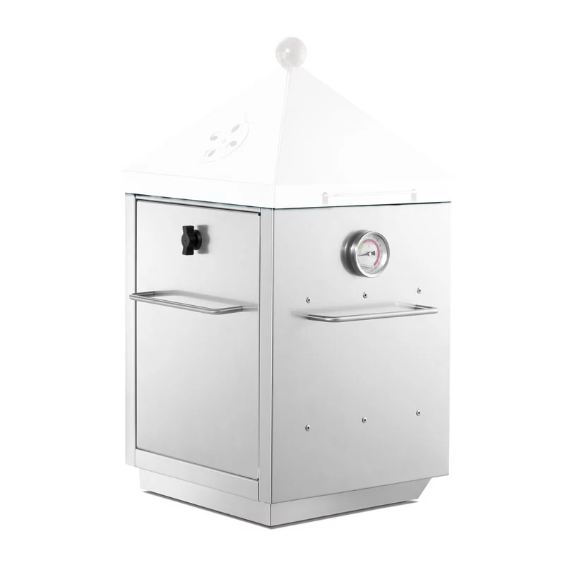 Mit Hilfe des Räucheraufsatzes verwandeln sich die Tisch- und Steckgrille von Thüros im Nu in eine Räucherstation. Der Aufsatz für das Räuchern ist erst mit der passenden Barbecuehaube komplett. Zum Lieferumfang gehört ein Thermometer mit der Möglichkeit, Temperaturen bis zu 260 ° Celsius anzuzeigen. Mit dem Räucheraufsatz aus rostresistentem Edelstahl kann man nicht nur Fisch und Fleisch auf vier Ebenen räuchern, sondern auch backen, dünsten und barbecue-grillen.